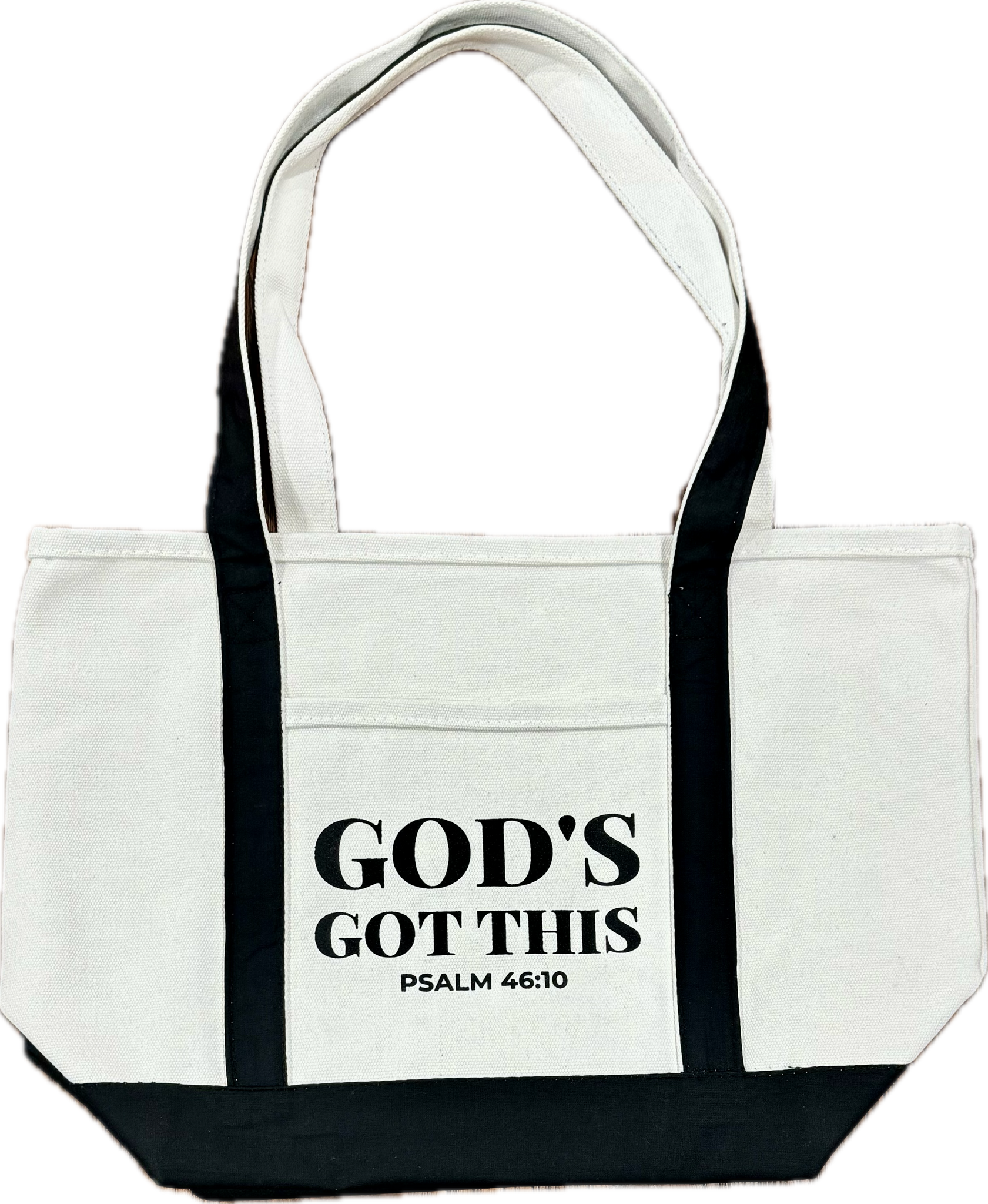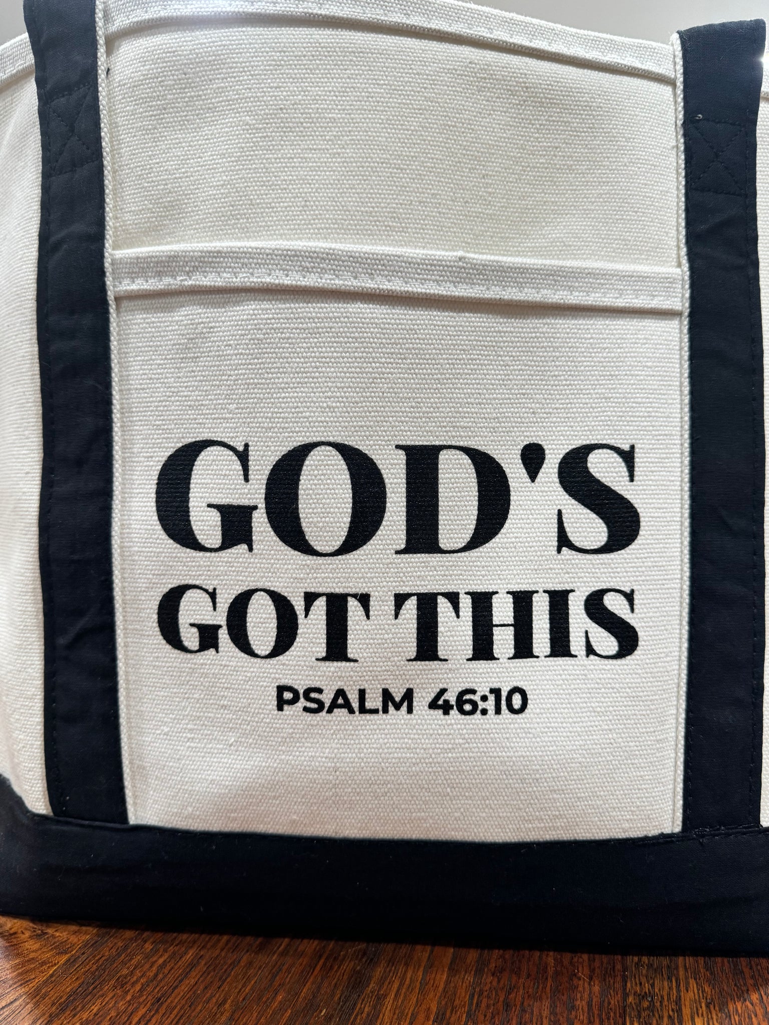 This canvas tote was made to serve as an encouraging reminder be still and seek, thank, praise, and listen to God because... God's Got This! Of course, we, in our humanness tend to get in our own way -- and sometimes we need a reminder that God's Got This, always.
